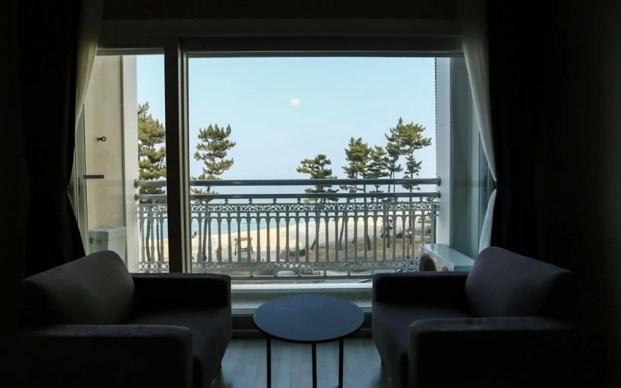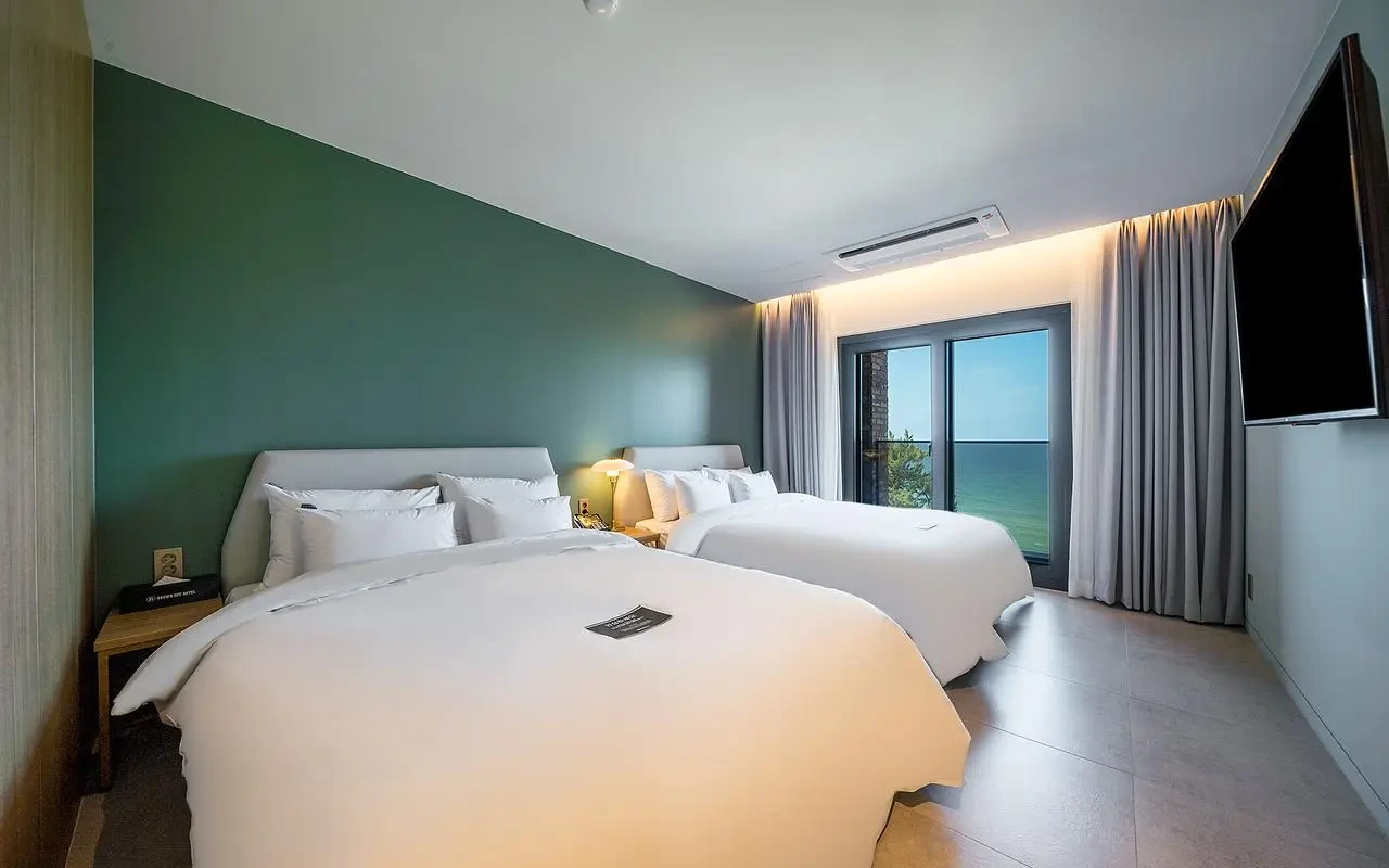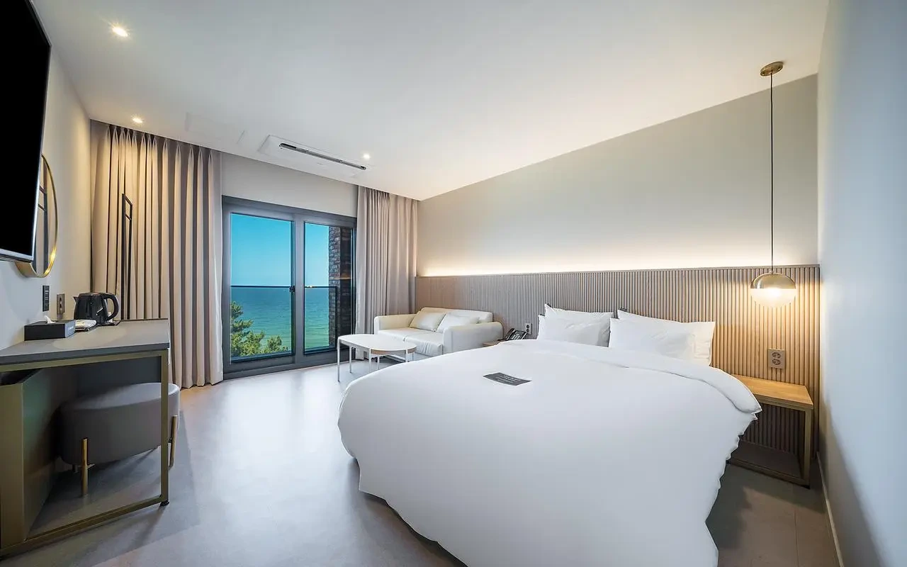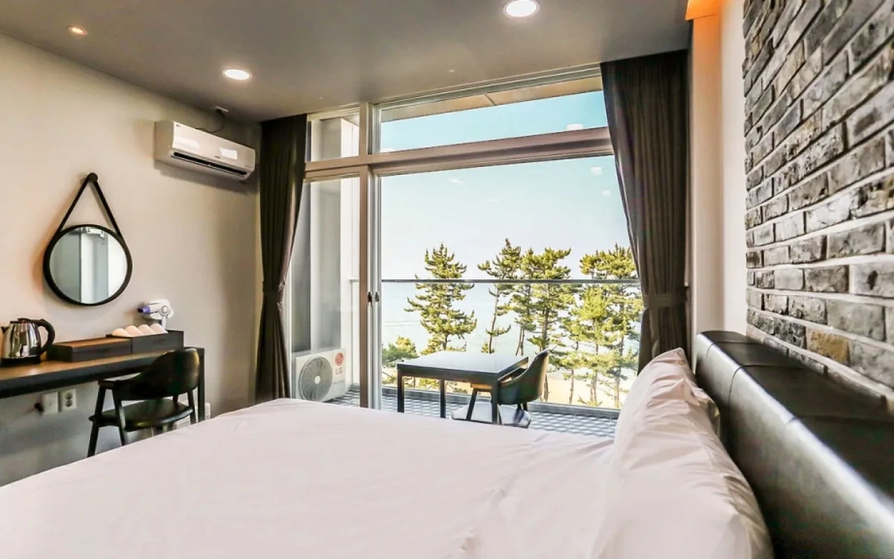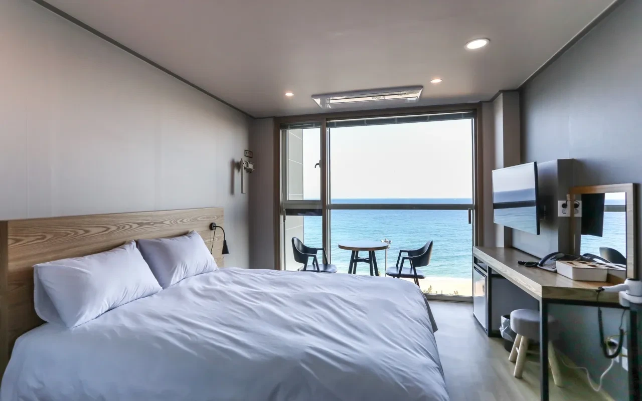 강릉 경포 모텔은 오션뷰 객실도 보유하고 있다. 테라스도 있어 여유로운 시간을 보내기 좋다. 커다란 통창으로는 강릉의 바다와 소나무를 감상할 수 있다. 누워서 일출을 볼 수 있어 해돋이 숙소로도 인기가 많다. 화이트와 우드로 이루어진 인테리어는 호불호 없는 편안함을 제공한다.