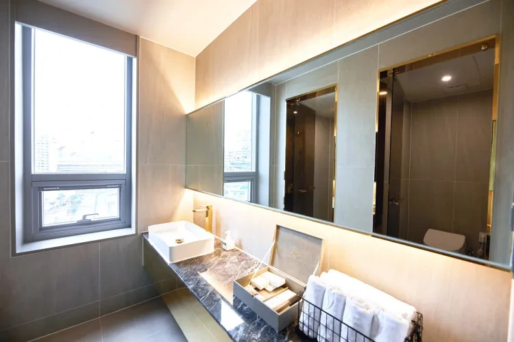 새로 생긴 호텔답게 골드로 포인트를 준 욕실 인테리어마저 고급스럽다. 샤워실과 화장실은 분리되어 있다. 어메니티로는 샴푸, 바디워시, 린스가 리필형 용기로 제공되는데, 칫솔, 치약, 수건, 드라이기 등도 비치해 놨다.