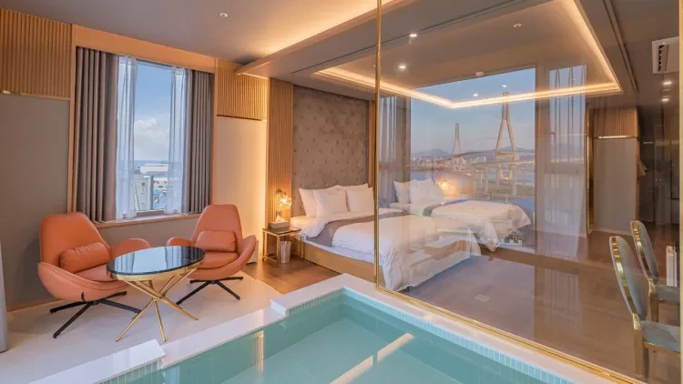 영도 그랜드베른호텔의 로얄 스위트룸은 연인, 친구와 함께 방문하기에도 좋으며 가족과 함께 찾기에도 좋은 객실이다. 기준 2인, 최대 4인까지 입실할 수 있다. 객실에 들어서자마자 보이는 탁 트인 영도 바다와 부산항대교가 마치 한 폭의 그림 같은데, 객실 내 수영장이 꽤나 넓은 편이라서 놀기에도 좋다. 깊지 않기 때문에 아이들이 놀기에도 적당하다.