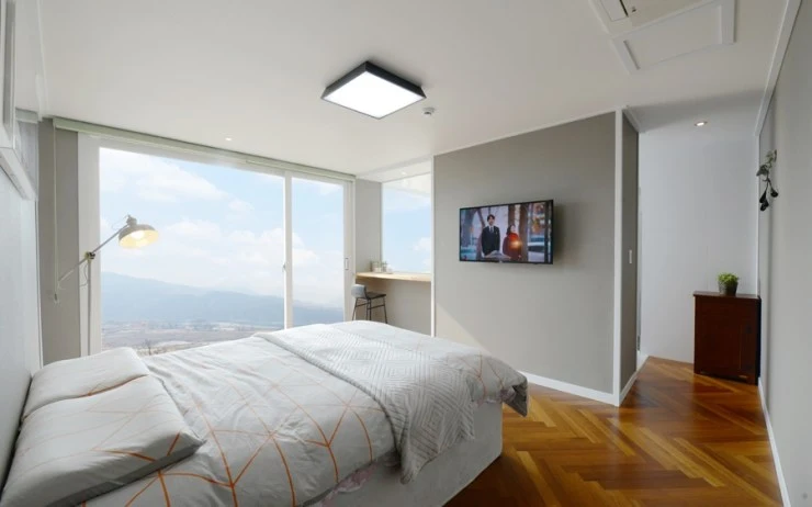 단양 숙소는 객실 뷰도 환상적이다. 커다란 통창으로 마당에서 보던 뷰를 그대로 감상할 수 있다.