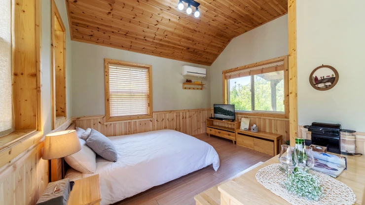 단양 숙소는 그린동, 옐로우동 2개의 독채를 운영하고 있다. 동화에서 튀어나온 듯 아기자기한 감성의 원목 펜션으로 사방이 숲으로 둘러싸여 마운틴뷰도 감상할 수 있다.