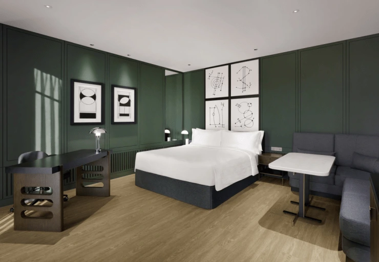 스페인 출신 디자이너 라자로 로사 비올란은 ‘중력’이라는 콘셉트를 서로 다른 구조와 형태로 호텔 곳곳에 반영했다. 레드와 그린, 그레이 등의 컬러를 사용한 객실은 자연광과 어우러져 고급스러운 분위기를 만들어 준다.