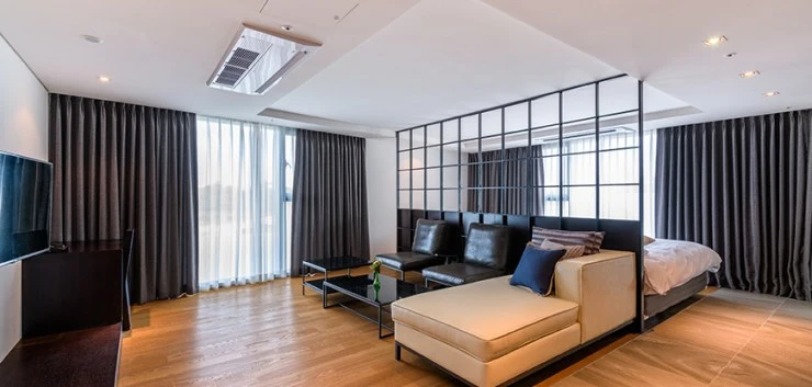 브라운스위트제주 호텔의 패밀리 스위트룸은 4인 가족이 편안히 머무를 수 있는 객실로 거실과 침실은 개방형 파티션으로 나눠져 답답함을 없애고, 거실에는 편안한 소파와 47인치 Full HD TV도 설치돼 있다.