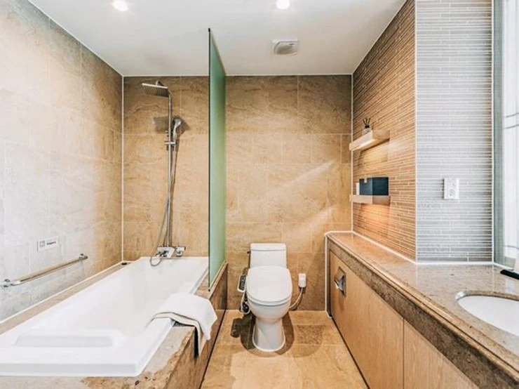 욕실에는 욕조와 비데가 설치되어 있고 어메니티로 샴푸와 린스, 바디워시, 바디로션, 칫솔과 치약, 면도기, 샤워캡, 면봉, 빗, 화장솜, 타월, 드라이기까지 제공된다.