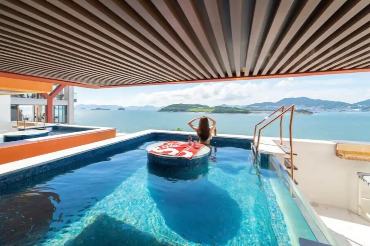 특별한 저녁을 꿈꾼다면, 여수 슈가브리움 플로팅 선셋 서비스를 이용해 보자. 스파클링 와인과 핑거푸드 등을 프라이빗 풀에 띄워 로맨틱한 시간을 보낼 수 있다. 가격은 2인 기준 8만 원이다.