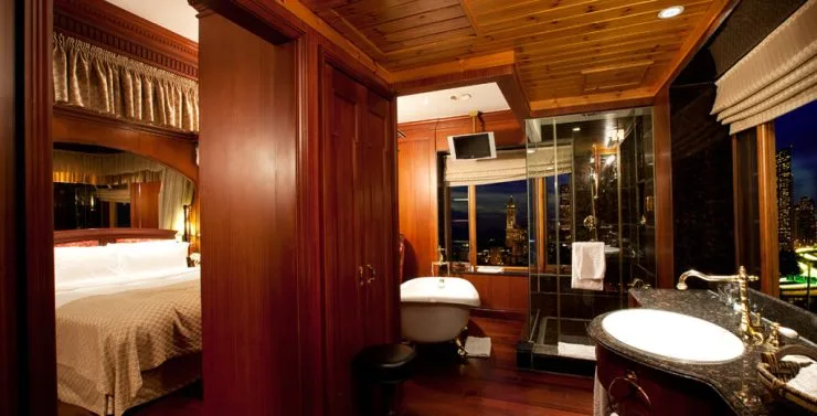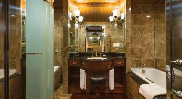 임피리얼 팰리스 서울의 욕실은 대리석으로 이루어졌으며 욕조도 구비되어 있다. 샴푸, 컨디셔너, 바디워시, 바디로션, 칫솔을 함께 제공한다.