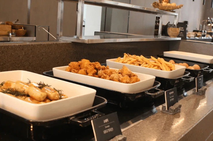 뷔페에는 스크램블드에그와 훈제 연어, 볶음밥, 베이컨, 소시지, 갈비, 즉석 우동 등 양식과 한식을 고루 갖췄어요. 샐러드만 해도 닭가슴살과 크랩, 파스타 등 종류가 다양해요. 어린이용 식기도 구비해 놨어요.