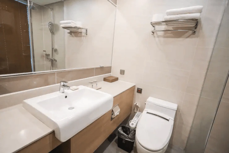 욕실에는 비데를 설치해 놨다. 샤워 부스에는 샴푸 겸 컨디셔너와 바디워시가 튜브형으로 비치돼 있다. 세면대 비누도 튜브형이다. 칫솔과 치약 등 일회용품은 필요 시, 프런트로 문의하면 된다.