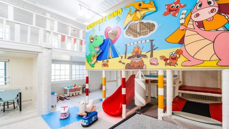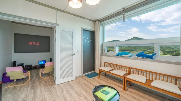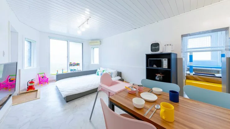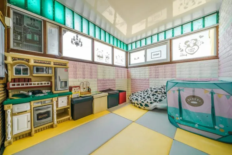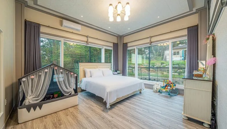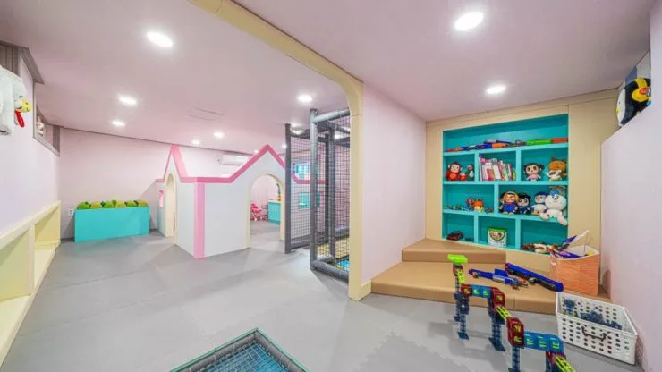 객실은 침실 3개와 욕실 2개로 구성됐다. 가장 큰 방에는 이스턴 킹사이즈 침대와 유아 침대가 설치돼 있고, 핑크방과 블루방에는 패밀리 침대와 어린이 이층 침대를 구비해 놨다. 키즈 놀이 시설로는 회전형 미끄럼틀과 트램펄린, 각종 장난감 등을 갖췄다. 이외 넷플릭스 시청이 가능한 대형 스크린 영화방도 있다.