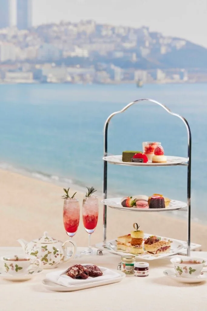 웨스틴조선 부산 파노라마라운지는 해운대의 풍경이 파노라마처럼 펼쳐지는 공간이다. 완벽한 오션뷰를 앞에 두고 애프터눈 티를 즐길 수 있다.