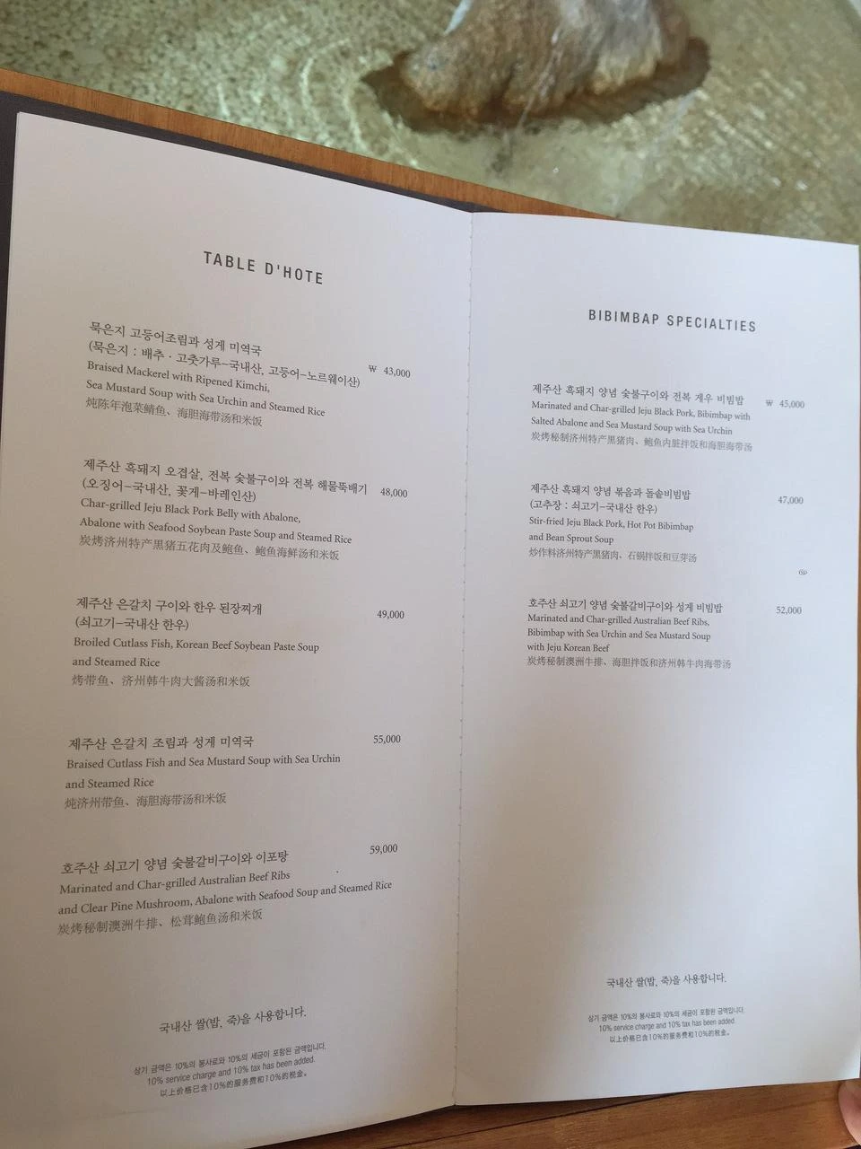 남편 전복 해물뚝배기 전체 상 모습. 반찬도 정갈하게 나옵니다. 가격은 48,000원입니다. 남편은 한식당에서 먹었던 요리 중에 제일 맛있었다고 하네요. 고기와 뚝배기 모두 한데 어우러진.. 남자들이 좋아하는 코스인가 봅니다.