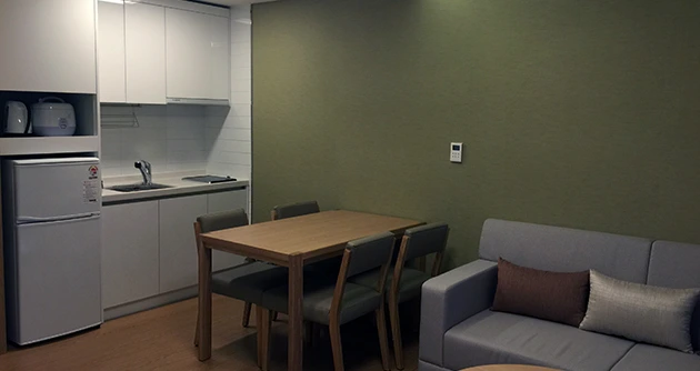 객실 내에 냉장고, 인덕션, 밥솥, 식탁 등 주방 공간과 각종 취사도구/식기류가 구비되어 있으니 저녁에 음식 포장해서 숙소에서 먹을 수 있다.