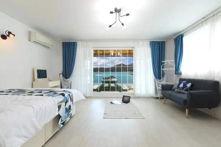 통영 시내와 접근성 좋은 오션뷰 바이더씨펜션이다. 인근에 산책로가 잘 되어 있고 카페가 많아서 커피 마시며 한적한 휴식을 취하기 좋은 곳이다. 객실 내에 들어가면 통유리창으로 푸른 통영 바다를 볼 수 있다. 소파, 화장대, 옷걸이, tv 등이 있고 샴푸, 컨디셔너, 바디워시, 치약, 비누, 드라이기, 수건 어메니티도 제공된다.