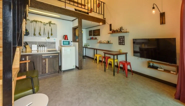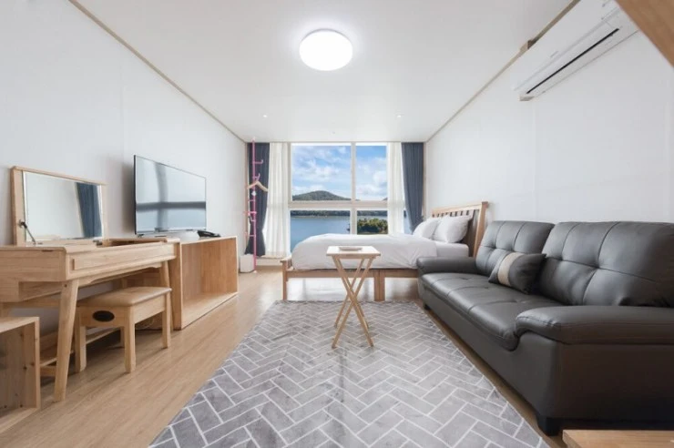 소파에 앉아서 tv 보거나 푹신한 침대에 누워서 휴식을 취할 수 있다. 간단한 취사가 가능한 밥솥, 전자레인지, 식기구 등 주방도구와 샴푸, 린스, 바디샤워, 치약, 수건이 제공된다. 사장님께 말씀하시면 보드게임, 만화책 등 대여가 가능하며 커피도 마실 수 있다. 아침 일찍 일어나면 분홍빛 하늘을 만날 수 있을 거다.