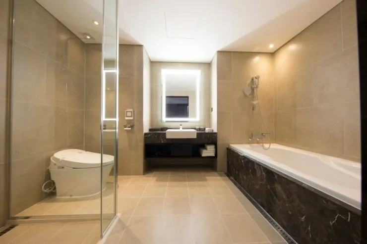 욕실에는 커다란 욕조가 있어 반신욕도 즐길 수 있다. 어메니티는 샴푸, 린스, 바디워시, 바디로션, 칫솔, 치약이 꼼꼼히 준비돼 있다.