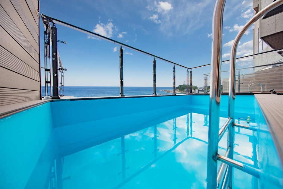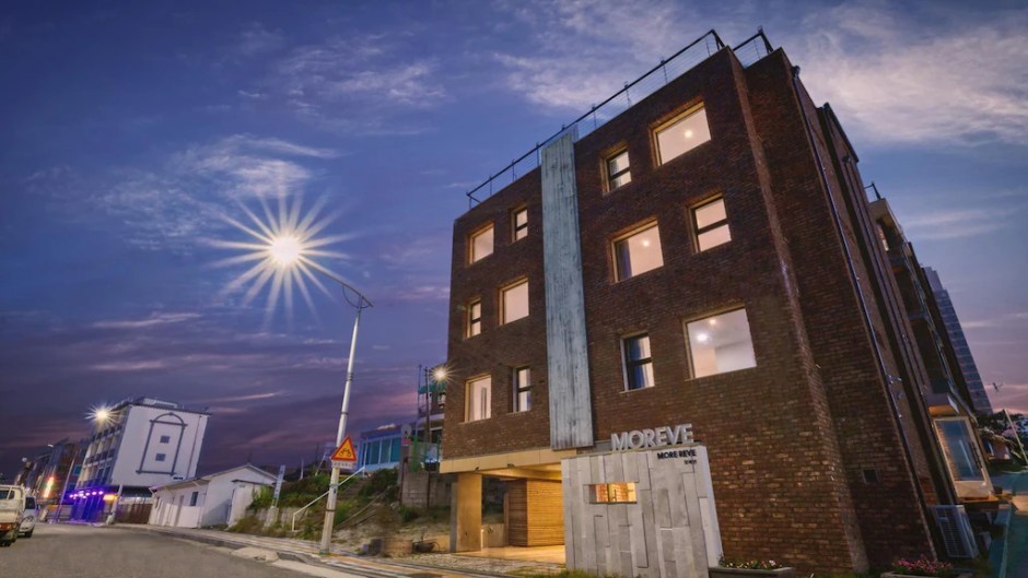 객실 문 열자마자 눈에 들어오는 깔끔하고 넓은 방, 통유리창 너머로 보이는 등대해변, 바다 보면서 즐기는 스파. 호텔식 침구류로 바스락거리며 포근하게 잠들 수 있는 풀빌라로 채광이 좋아서 아침엔 알람 대신 햇살이 깨워줄 거다. 테라스가 있어서 바다 보기에도 좋다. 1층에 카페, 식당, 편의점이 있고 루프탑에 수영장이 있는 가성비 좋은 숙소다.