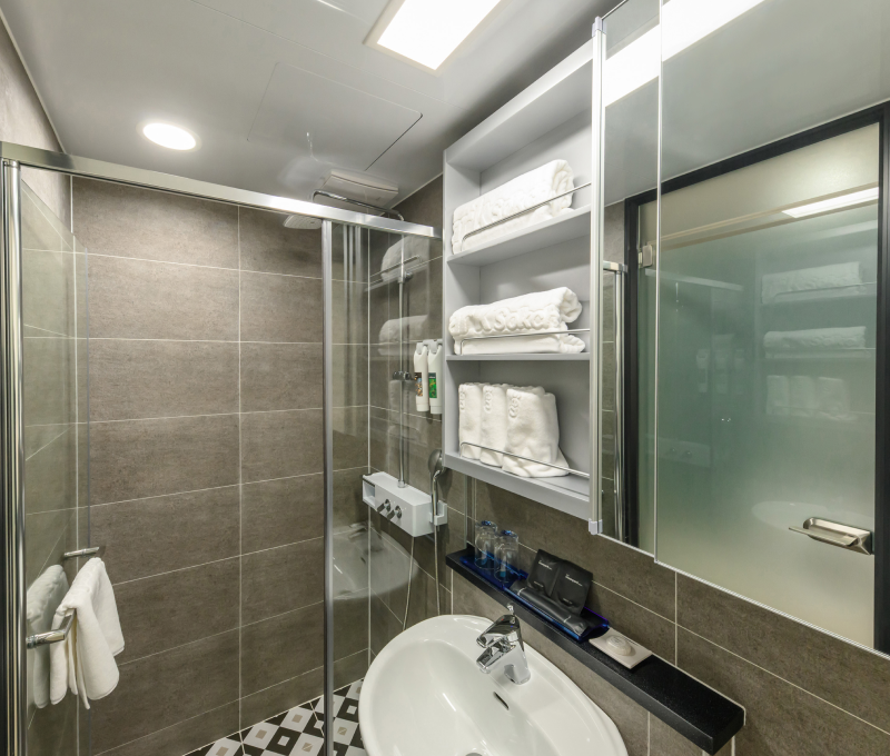 욕실은 깔끔한 샤워부스 형태로 어메니티는 샴푸 컨디셔너 바디워시가 벽 부착 디스펜서 형태로 제공된다. 이와 함께 비누, 수건, 헤어드라이어, 일회용 덴탈 킷, 샤워캡, 면봉/화장솜 등이 갖춰져 있다.