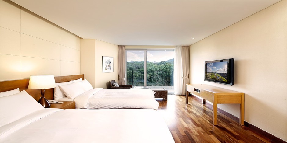 객실도 자연친화적인 분위기로 머무는 내내 편안함을 느낄 수 있을 거다. 기준 인원이 4인이기 때문에 동급의 객실에 비해 넓은 면적을 누릴 수 있다. 멋진 전망과 포근한 인테리어는 오래 머물고 싶게 만든다. 객실에는 개별 테라스가 있어 좀 더 생생한 자연을 느낄 수 있다. 욕실에는 욕조도 있어 반신욕이 가능하다.