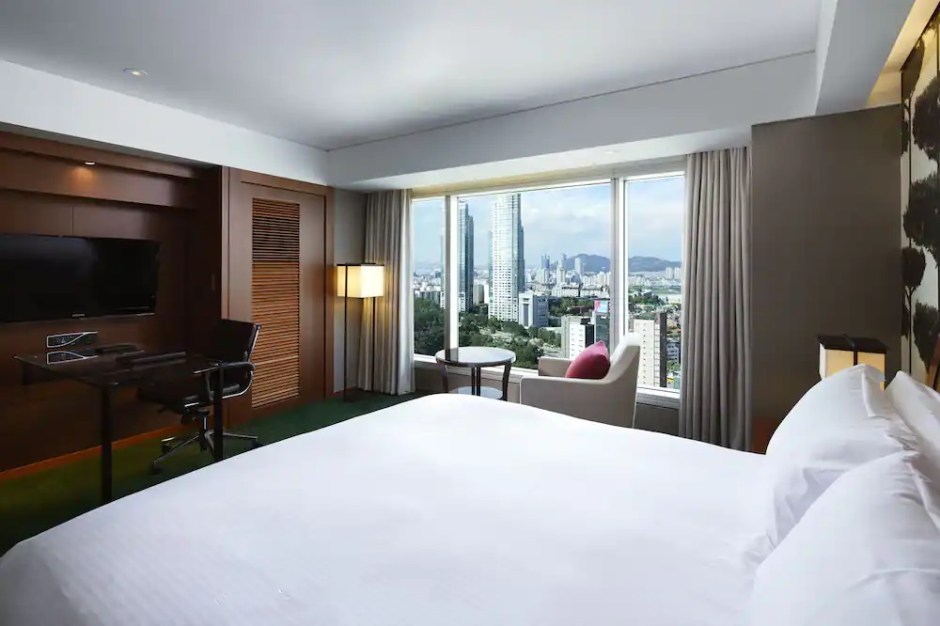 인터컨티넨탈 코엑스의 클럽 클래식 룸은 보태니컬 콘셉트의 객실인데, 꽃과 식물을 도안화해 화사한 분위기가 느껴진다. 객실에서는 한강 혹은 봉은사 전망도 감상할 수 있다. 널찍한 킹사이즈 베드 위에는 100% 순면 오리털 이불이 준비돼 있다. 베개도 10종류나 구비하고 있어 숙면을 도와준다.