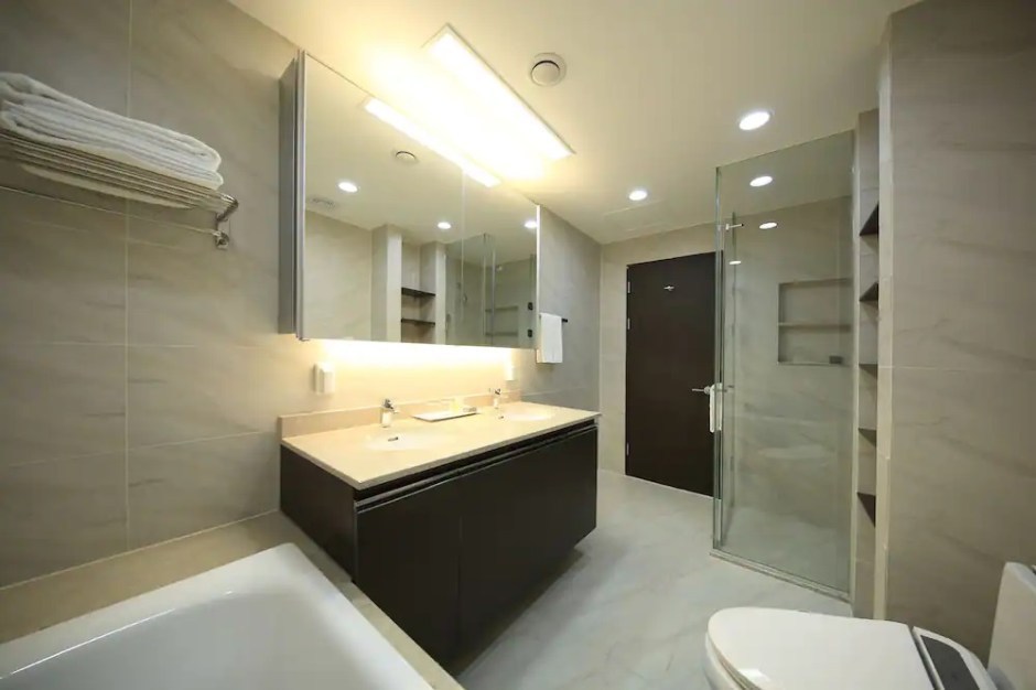 욕실 어메니티로는 샴푸와 바디워시, 바디로션, 비누, 샤워캡, 수건이 제공된다. 칫솔과 치약, 컨디셔너, 클렌징폼 등은 따로 챙겨 와야 한다. 깜박한 분은 도보 1분 거리에 자리한 편의점에서 구매 가능하다.