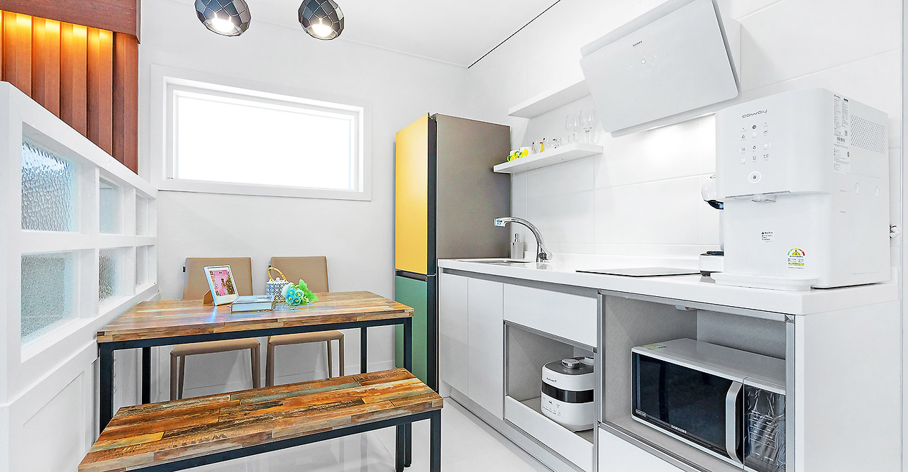 그뿐만이 아니라 객실 내부에서 취사가 가능하다! 비스포크 냉장고, 커피 머신, 정수기, 전기밥솥, 전자레인지, 각종 조미료와 식탁, 의자도 준비되어 있으니 아침부터 저녁 바비큐까지 문제없이 챙길 수 있다.