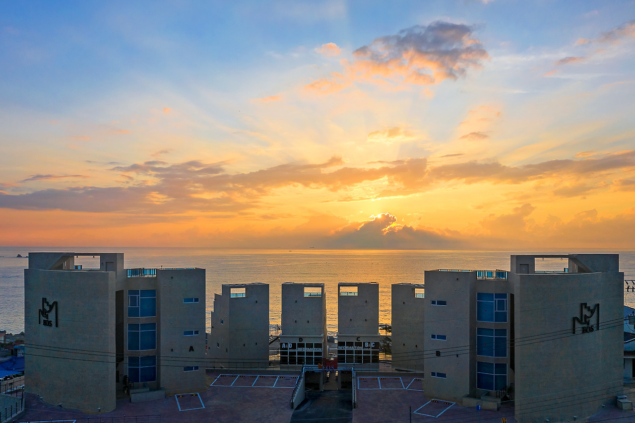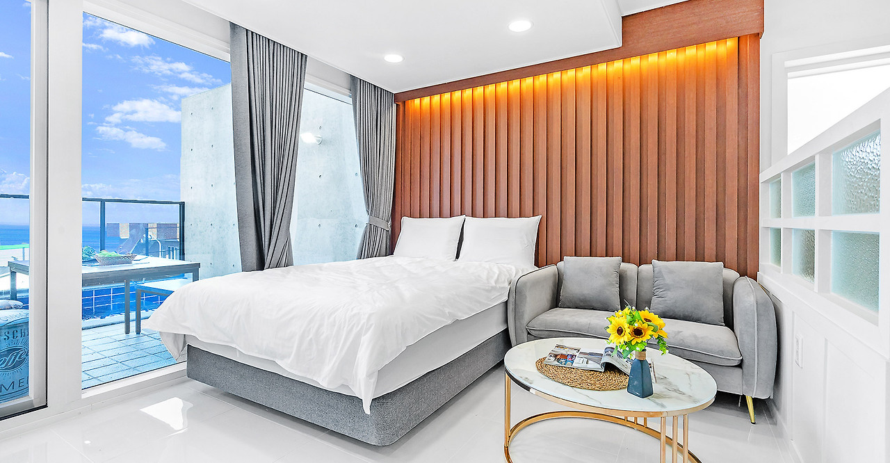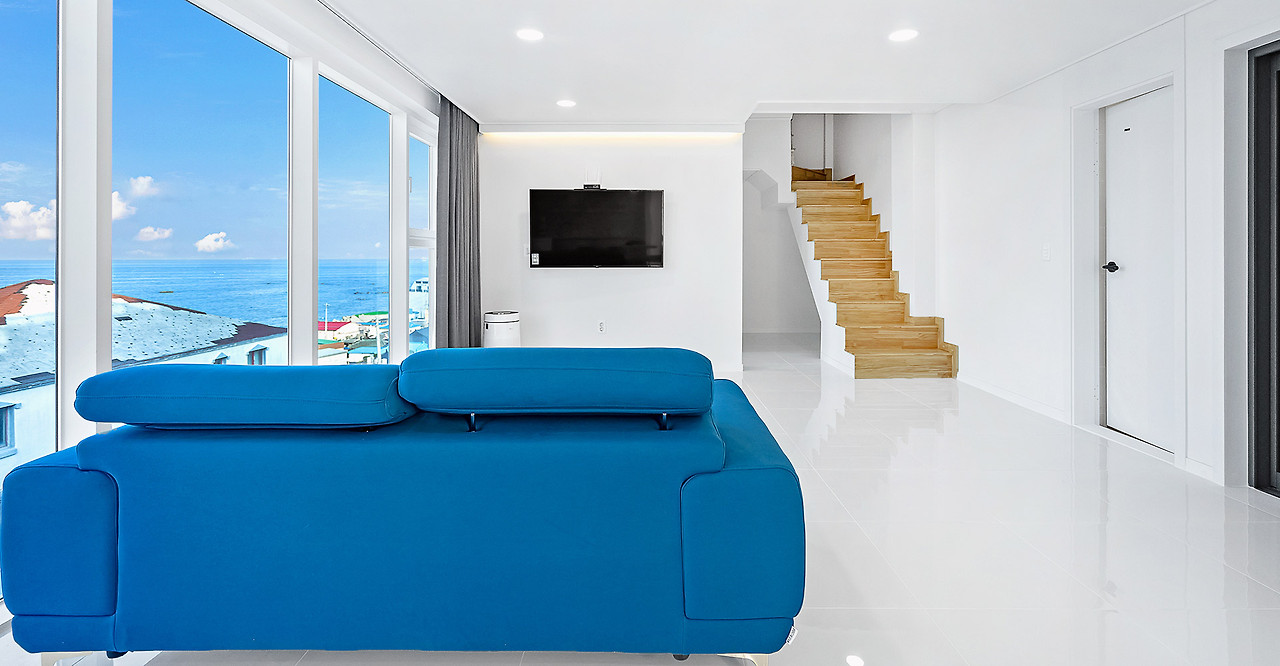 군더더기 없이 회색 건물로 시크함 그 자체인 이오스풀빌라 펜션! 내부로 들어서면 전면 통창이 설치되어 있어 푸른 감포 바다가 한눈에 들어온다. 아울러 주방과 전자기기 모두 비스포크와 LG 등으로 인테리어와 룸 컨디션에 신경 쓴 점이 인상적이다.