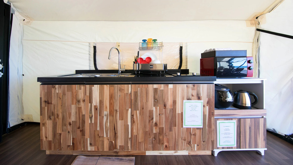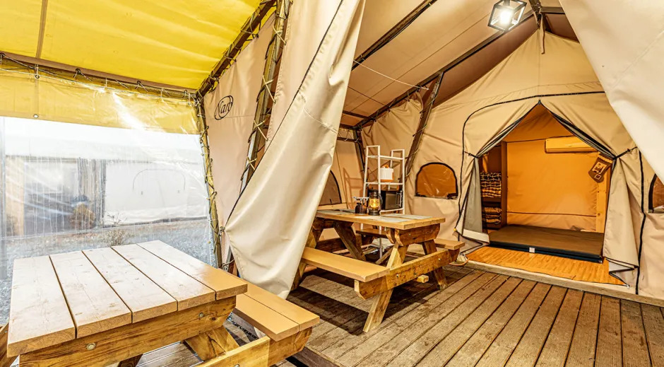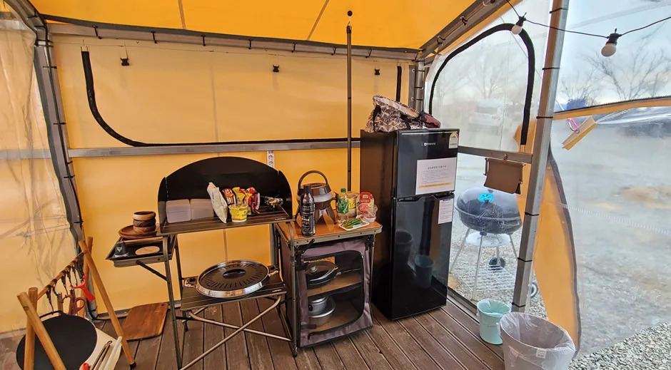 글램핑 객실은 구조와 위치에 따라 여러 타입으로 나뉜다. 기본형인 글램핑 A룸을 살펴보면, 침실과 욕실, 개별 데크로 구성됐다. 데크에는 싱크대와 냉장고, 전기 밥솥, 전자레인지 등 각종 주방 기구가 설치돼 있다. 가족 여행자라면 글램핑 투룸 객실을 추천하고 싶다. 침실 2개를 갖췄으며, 데크 공간도 더 여유롭다.