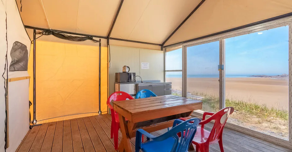 객실은 단층과 복층, 복층 VIP 타입으로 구성됐다. 일반적인 펜션 객실과 글램핑 텐트가 합쳐진 형태로, 둘의 장점을 모두 누릴 수 있다. 예를 들어 단층 룸은 침실 겸 거실, 욕실, 개별 테라스를 갖춘 구조로, 주방 시설도 완비했다. 테라스 밖으로는 탁 트인 바다가 보인다.