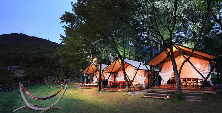가평 마이다스 호텔에서는 글램핑 텐트에서 바비큐를 즐길 수 있다. 런치, 디너로 나누어지며 텐트 내부에서 빔프로젝터를 이용할 수 있다. 숙박은 불가하며 다이닝과 공간 대여가 가능하다.