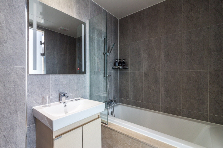우선 욕실에는 욕조가 설치되어 있어 반신욕을 즐길 수 있어 더 반가운데, 어메니티로는 샴푸, 린스, 바디워시, 드라이어, 수건, 가운 등이 준비된다.