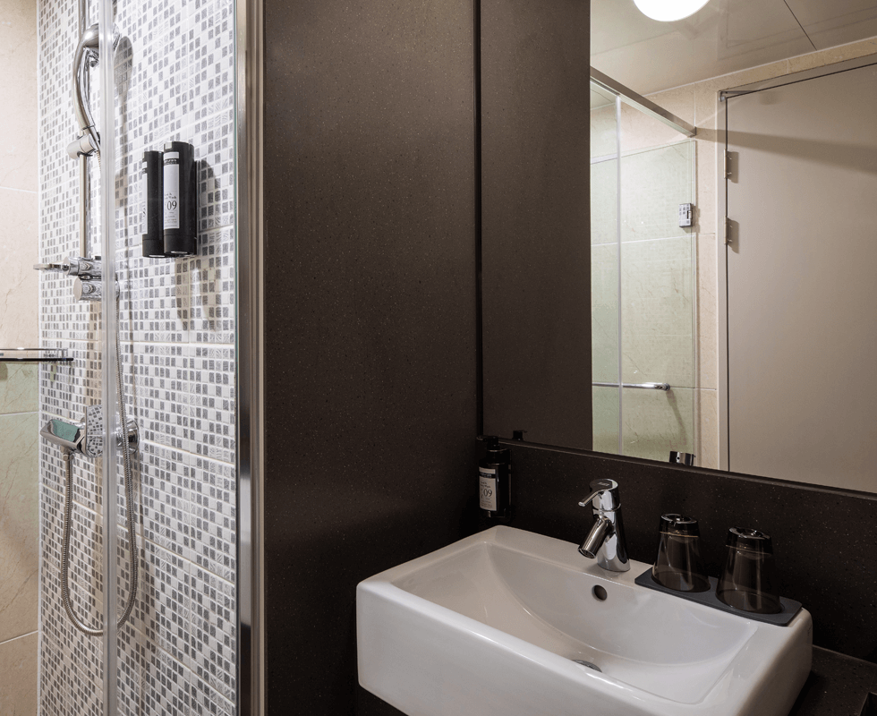 욕실에는 샴푸와 바디워시가 리필형으로 부착되어 있다. 대용량으로 제공되니 넉넉하게 사용할 수 있을 거다! 이와 함께 수건, 헤어드라이어, 핸드워시 등이 준비된다. 개별적으로 치약과 칫솔, 세안제는 챙겨 와야 한다.