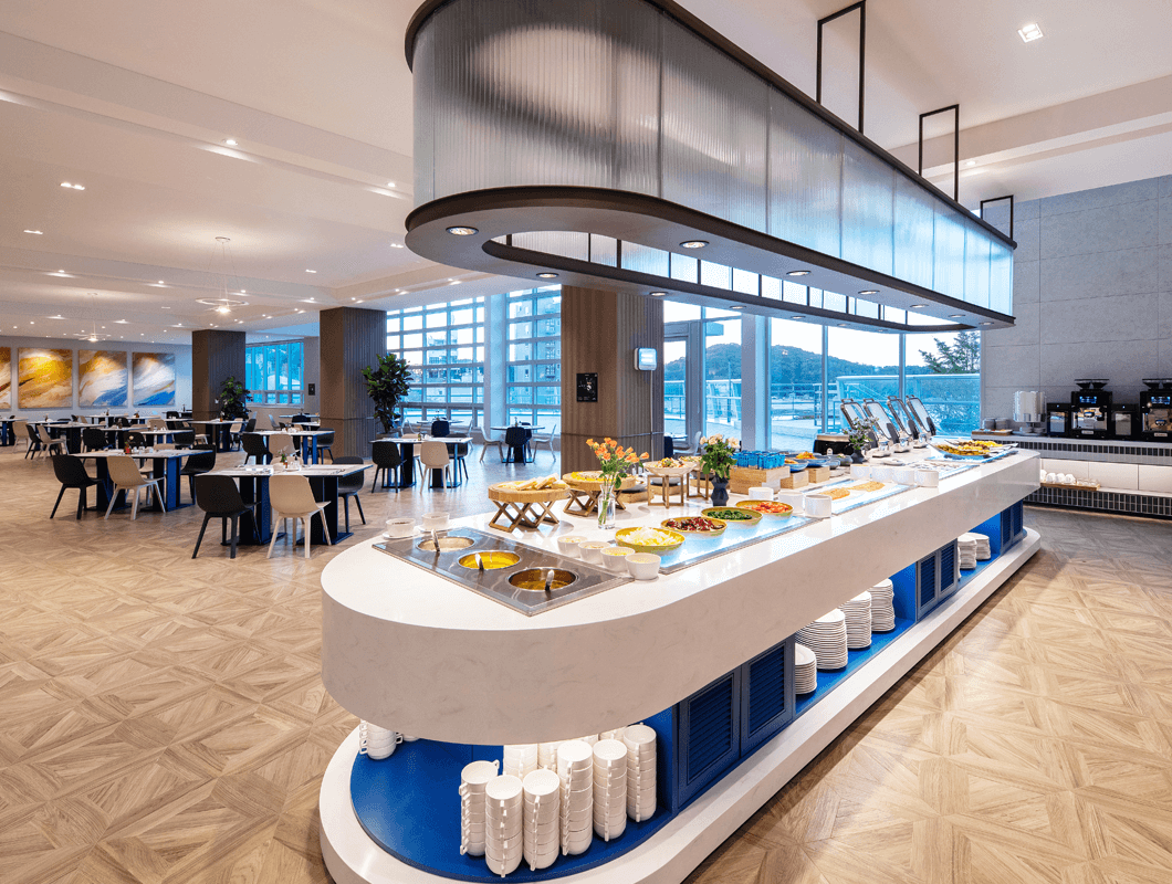 을왕리 호텔 더위크앤 리조트의 아침식사는 07:00 ~ 10:00 사이에 제공되고 있다. 기존에는 뷔페식으로 제공됐으나, 코로나19 확산 방지를 위해 단품 메뉴로 대체되어 운영되고 있다.