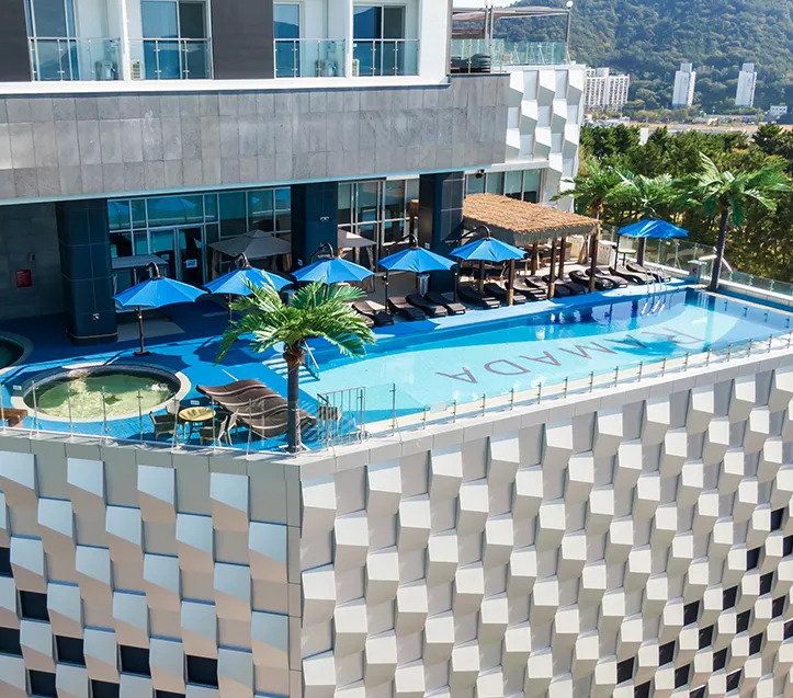 화려하고 모던한 인테리어와 외관이 돋보이는 여수 라마다호텔은 특히나 5층에 위치한 인피니티 풀의 인테리어가 매력적인 호텔로, 객실 위에서 인피니티 풀과 바다를 함께 바라보는 뷰가 아름다운 곳이다.