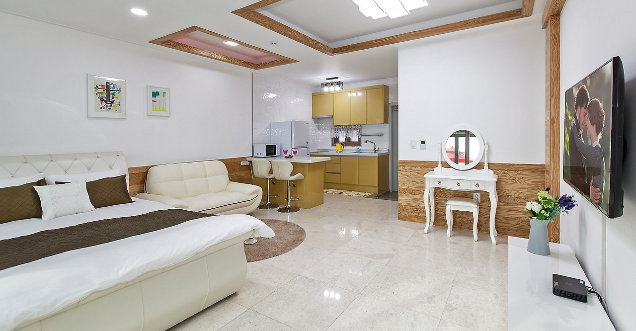 사진 속 객실은 102 비앙카로 원룸형 객실이지만 내부에 스파 시설은 물론, TV, 침대, 소파, 에어컨, 화장대, 주방시설 일체가 준비되어 있다. 그뿐만이 아니라 비교적 신축형 숙소로 대체로 쾌적한 컨디션을 자랑하는 곳이다.