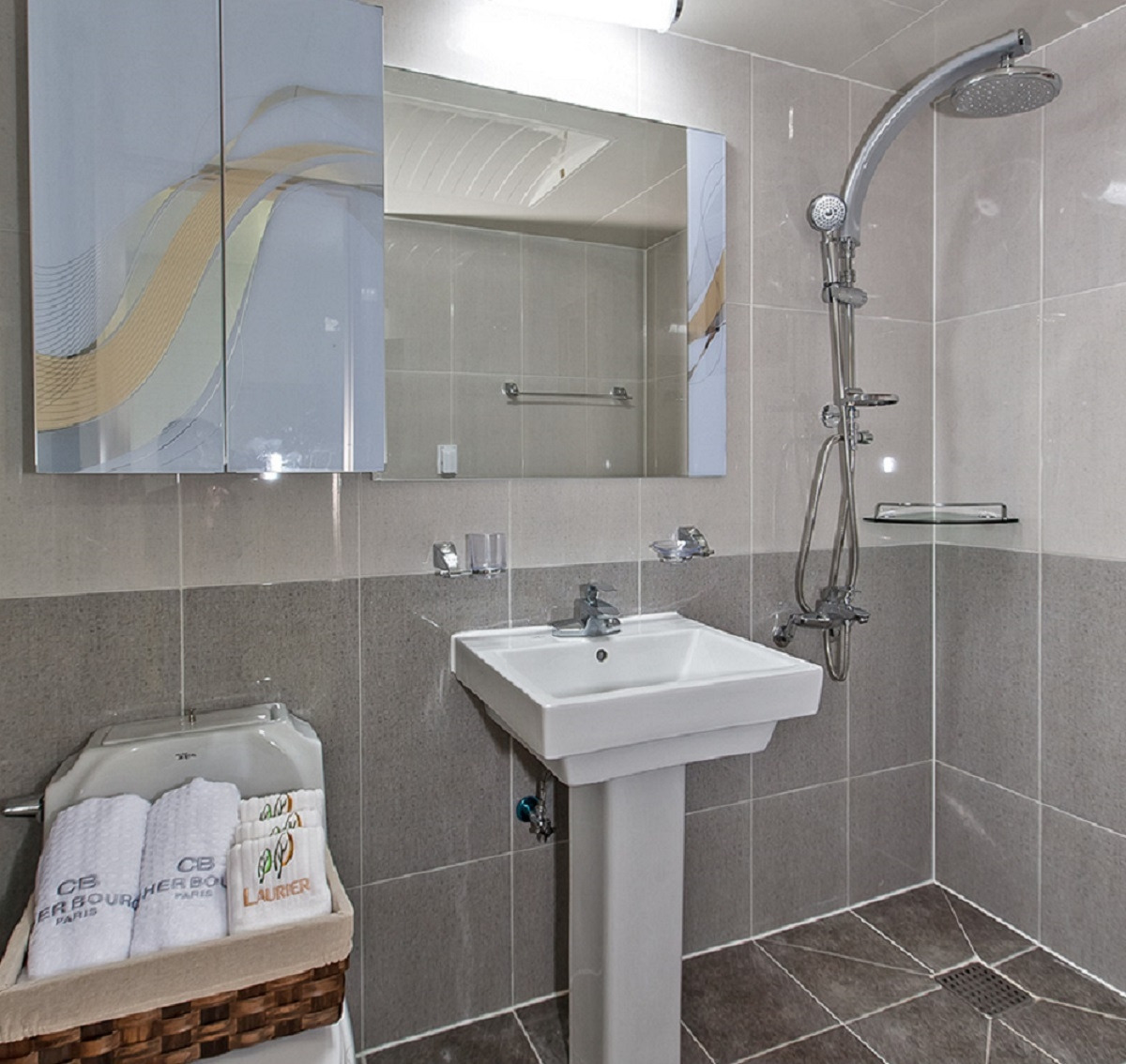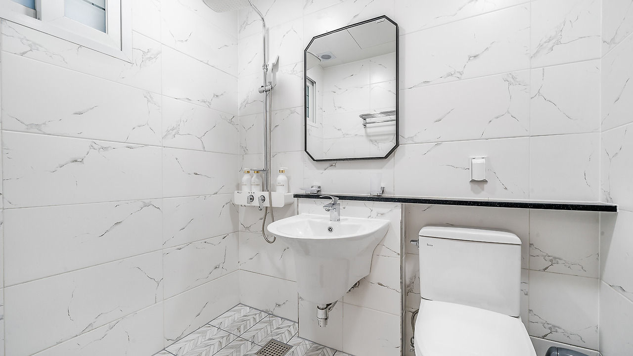 욕실은 샤워기가 설치되어 있고 어메니티로는 대형 샴푸와 린스, 바디워시, 치약과 칫솔, 비누, 헤어드라이어, 그리고 수건도 넉넉하게 준비되니 개별적으로 챙겨오실 건 세안제와 면도기 정도면 될 거다!