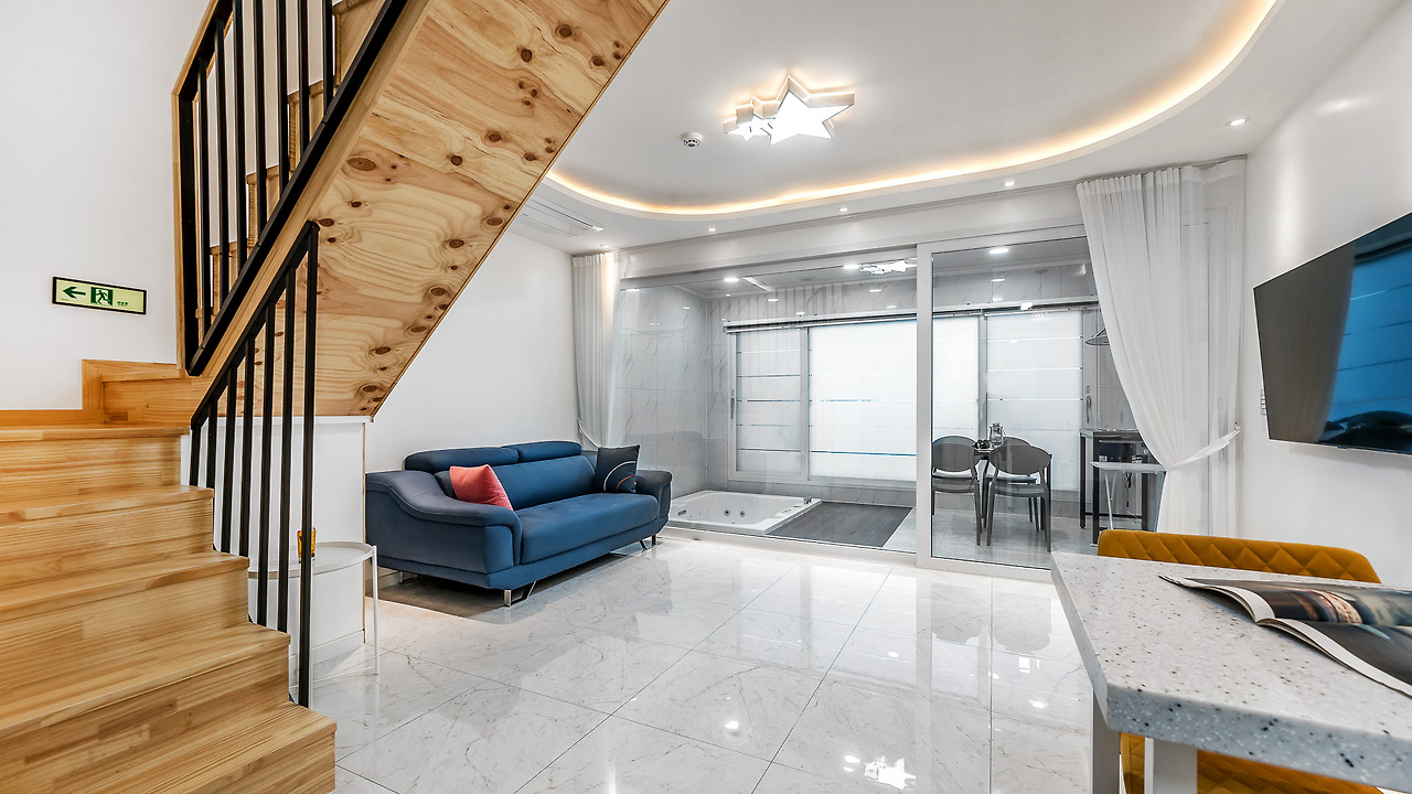 104호는 25평, 복층형 객실로 1층에는 거실 겸 주방과 테라스가 준비되어 있어 그곳에서 개인 스파와 바비큐 파티를 즐길 수 있는데요. 2층은 침실과 바다 전망의 테라스까지 갖춘 완벽한 힐링 공간으로 이루어져 있답니다.