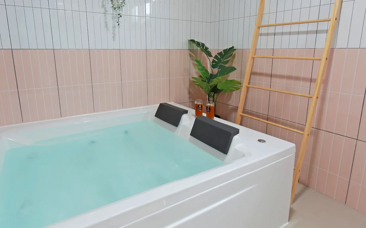 어메니티는 샴푸, 린스, 바디워시, 치약이 준비돼 있다. 아모르, 블랑 객실에서는 개별 스파도 즐길 수 있다. 욕실까지 센스 있는 경주 감성펜션이다.