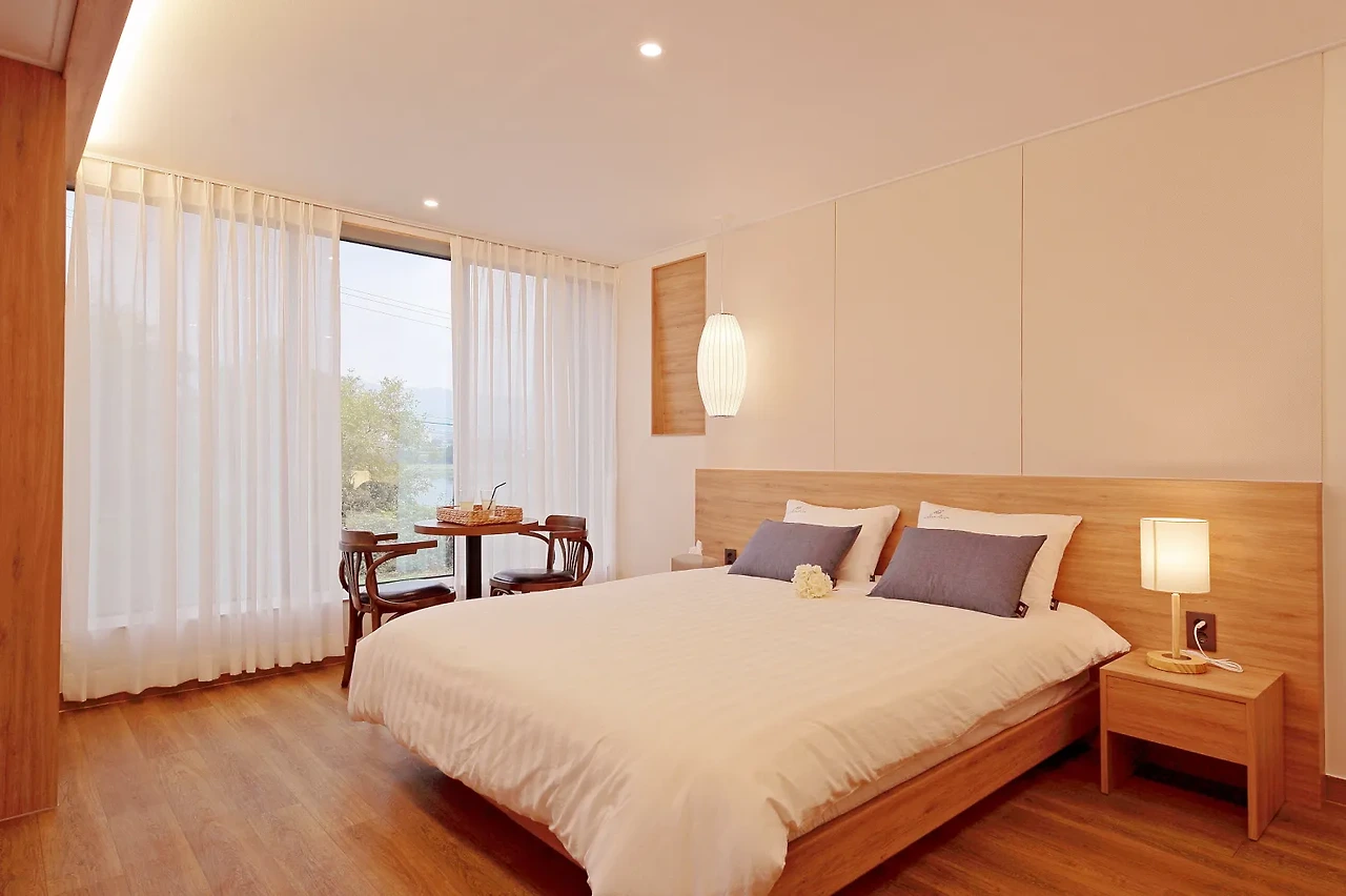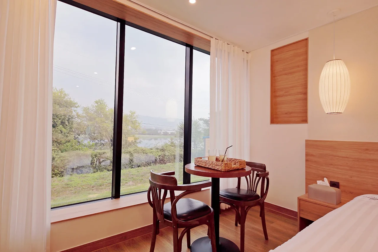 베니아펜션은 전 객실 호수뷰를 자랑하는 뷰맛집 숙소로 커다란 통창으로 대재지 호수뷰를 즐길 수 있다. 사이드 테이블과 의자도 있어 편안한 시간을 보낼 수 있다.