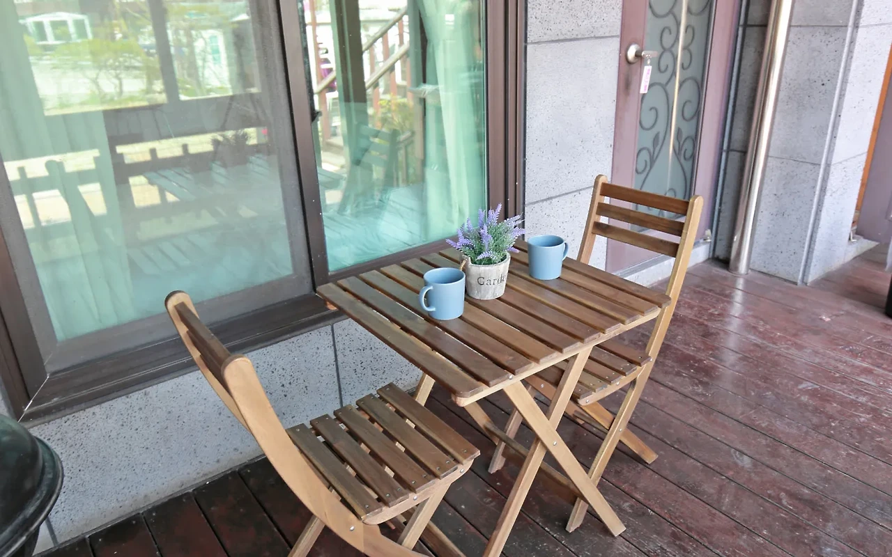 아기자기한 주방에서는 간단한 취사도 가능하다. 취사도구와 전자레인지도 준비돼 있다. 개별 테라스가 있어 조용히 시간을 보내기 좋다.