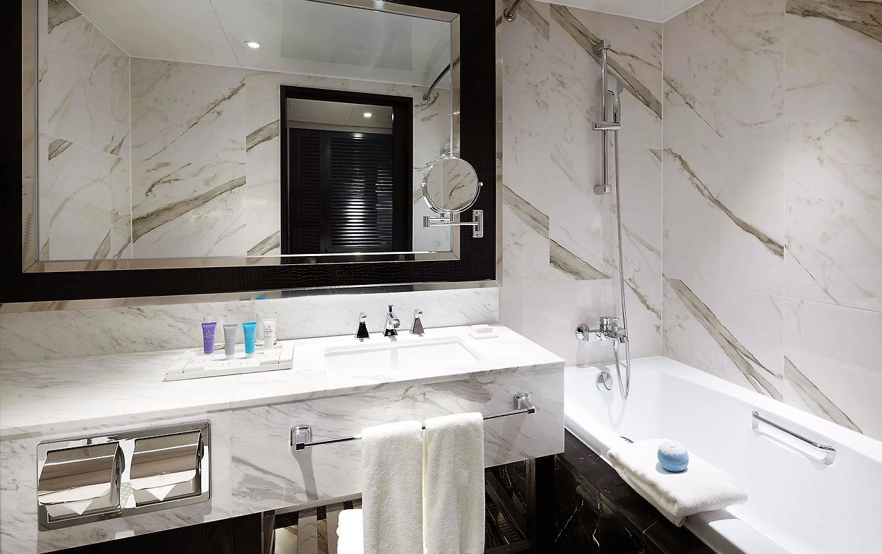 욕실 역시 대리석으로 마감되어 고급스러운 분위기가 물씬 풍긴다. 객실에 따라 욕조 또는 샤워부스가 설치되어 있으니 반신욕을 즐기며 호캉스를 만끽하고 싶다면 욕조 유무를 꼭 체크해야 한다. 아울러, 어메니티로는 샴푸, 린스, 바디워시, 바디로션, 심지어 덴탈 키트와 면도기까지 모두 구비되어 있다. 개인적으로 세안용품 정도만 챙겨와도 될 거다!