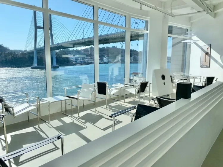 카페 낭만도시는 자산공원에 위치한 카페이다. 거북선대교가 보이는 오션뷰 카페인데, 통 유리창으로 이루어져 있어 뻥 뚫린 바다 풍경을 만날 수 있다.