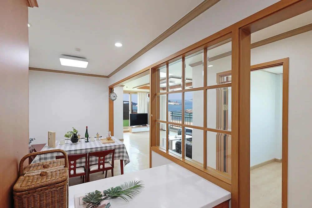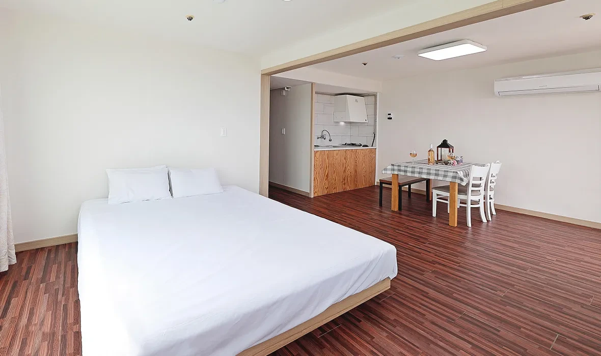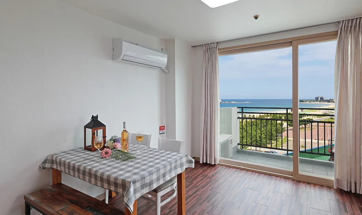 최근 리모델링으로 쾌적하고 깔끔한 룸 컨디션에서 휴식을 취할 수 있다. 침구료도 깨끗하고 포근해요. 객실에서 삼포 해수욕장 뷰를 볼 수 있다. 침실과 거실 겸 주방이 나누어져 있고 냉장고, 식탁, TV, 밥솥, 취사시설 등도 마련되어 있다. 특히 오션뷰 객실을 예약하시면 일출을 보실 수 있다. 객실이 넓어서 가족 여행객이 많이 찾는다.