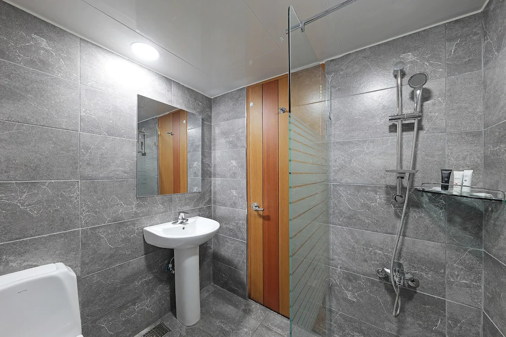 욕조는 없지만, 샤워공간과 화장실이 구분되어 있다. 칫솔, 샴푸, 린스, 바디워시, 헤어드라이기, 일회용 칫솔, 수건 등 기본 어메니티가 제공된다.