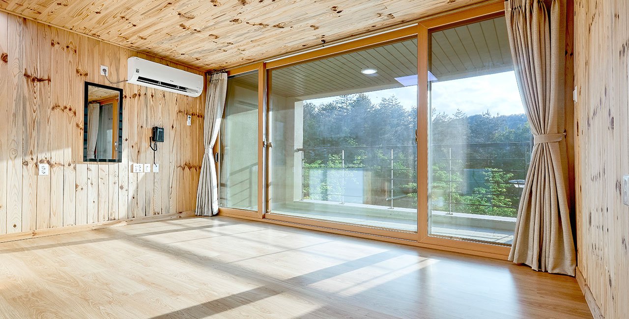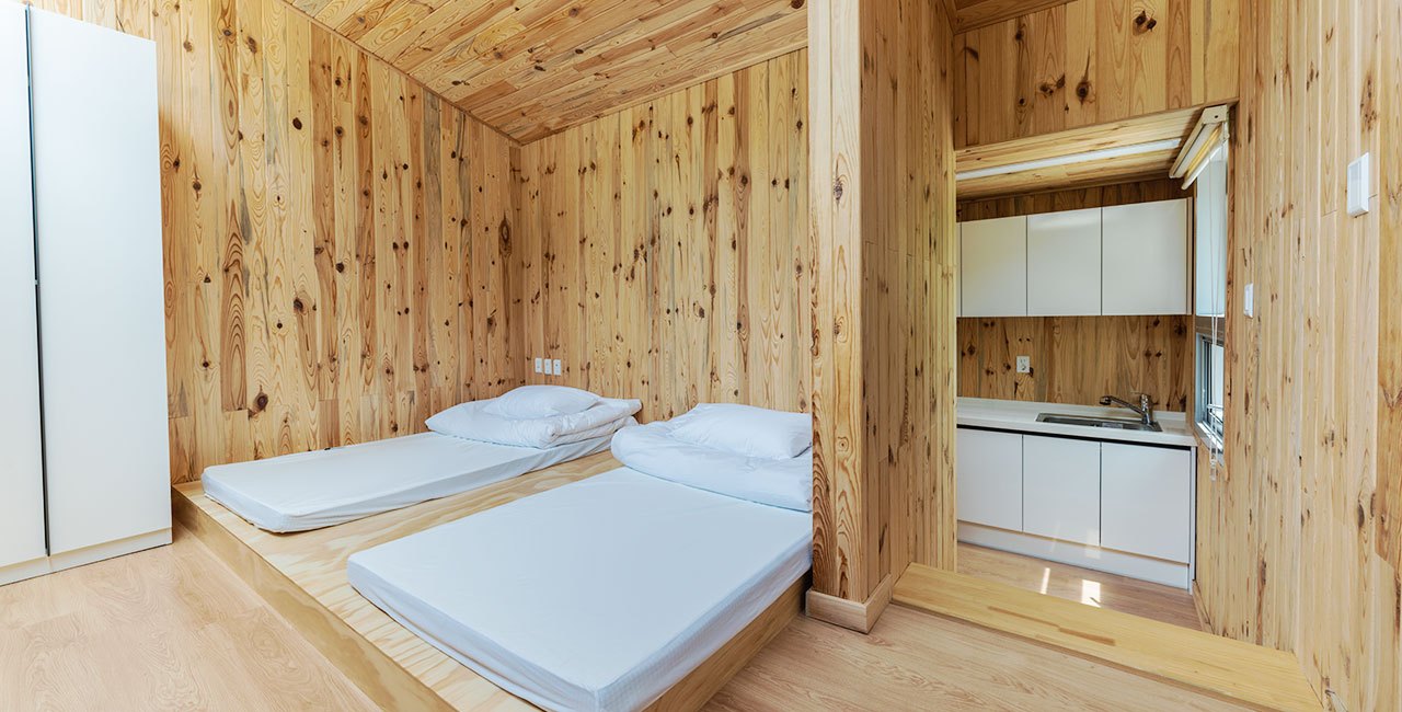 수련동은 금강송 숲 사이로 따뜻한 채광이 드리우는 객실로 2인에서 4인까지 투숙 가능한 객실로 내부에는 인원수에 맞게 요 이불 세트가 준비되어 있다.