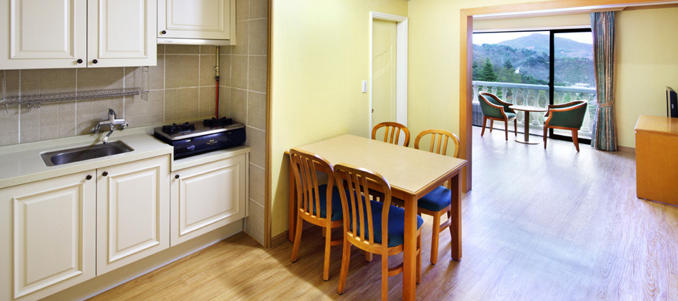 무엇보다 레지던스 타입이라 주방도 포함되어 있어 직접 요리를 하거나, 밀키트 혹은 포장 음식을 따뜻하게 데워서 먹을 때도 유용하다! 아울러 발코니가 준비되어 있어 탁 트인 백암산 전경을 감상하기에도 좋다.