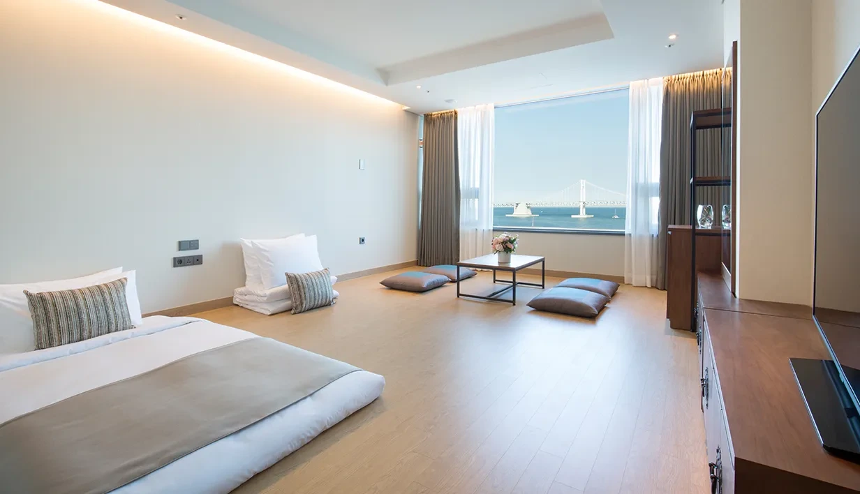 광안리 숙소는 전 객실에서 광안대교를 감상할 수 있다. 굳이 오션뷰 카페를 찾아가지 않아도 될 정도로 전망이 좋다. 저녁에는 아름다운 야경도 감상할 수 있다. 객실 타입은 디럭스, 럭셔리, 온돌 스위트, 스위트 크게 4가지다. 코너 객실은 선택하면 이색적인 오션뷰를 감상할 수 있다. 온돌 객실도 있어 가족 여행객도 편하게 머무를 수 있다.
