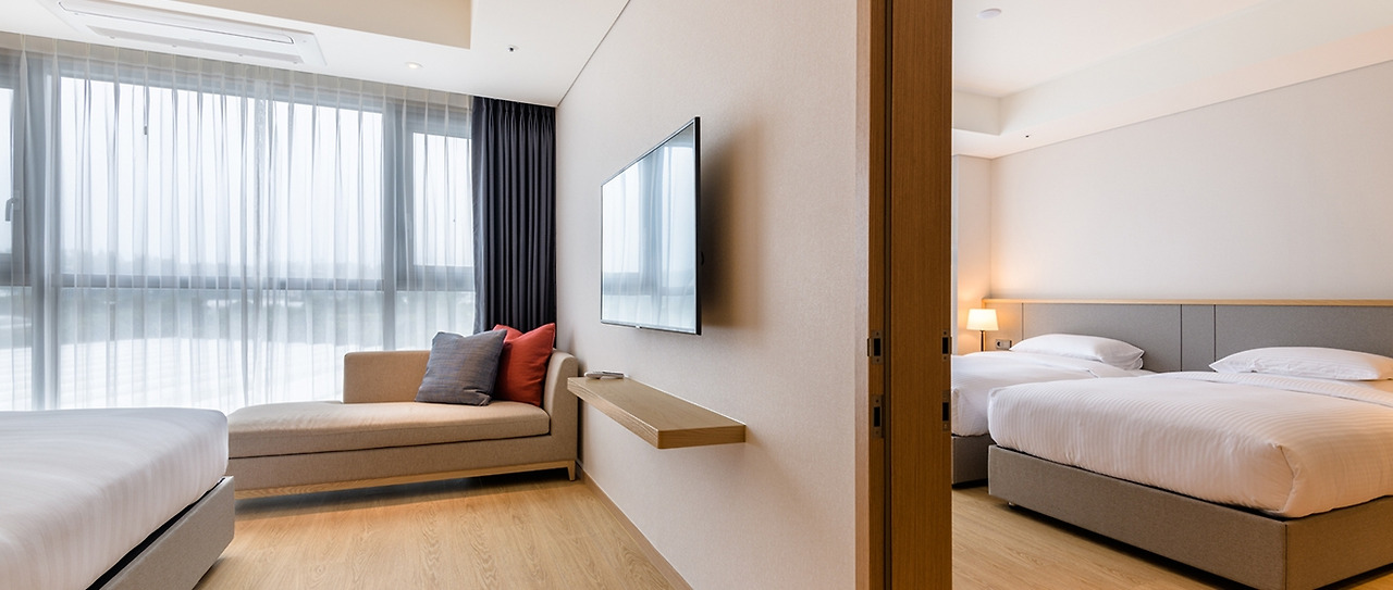 더 그랜드 섬오름의 객실은 파노라마 스위트와 프리미어 패밀리 트윈룸을 제외하고는 모두 2인 기준 객실로 이루어져 있는데, 친구들과 또는 부모님과 함께하는 숙소 찾는 분들 중에 적당한 가격대에 공간 분리도 이루어진 곳을 원하신다면 슈페리어 더블 & 트윈룸을 커넥팅룸으로 이용해 보시면 어떨까? 각각 객실에 침대와 욕실이 준비되어 있으니 독립적이고 효율적으로 이용할 수 있을 거다.