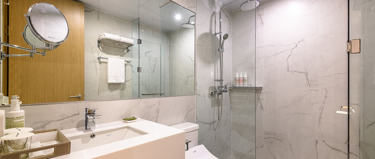 욕실에는 샤워부스가 설치되어 있고, 어메니티로는 대용량의 샴푸와 헤어 컨디셔너, 바디워시가 디스펜서 형태로 부착되어 있다. 아울러 세면대에는 칫솔과 치약, 비누, 면봉, 빗, 샤워캡 등이 준비되어 있다. 그밖에 객실 어메니티로는 헤어드라이어, 실내화, 생수 및 전통차 등이 무료로 제공된다.