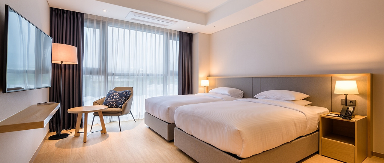 슈페리어 트윈룸은 더 그랜드 섬오름 호텔에서도 작년에 새롭게 오픈한 신관에 자리한 객실로 두 개의 더블베드가 있어 성인 2명 또는 아이를 동반한 3인 가족 여행객에게 추천하는 객실이다.