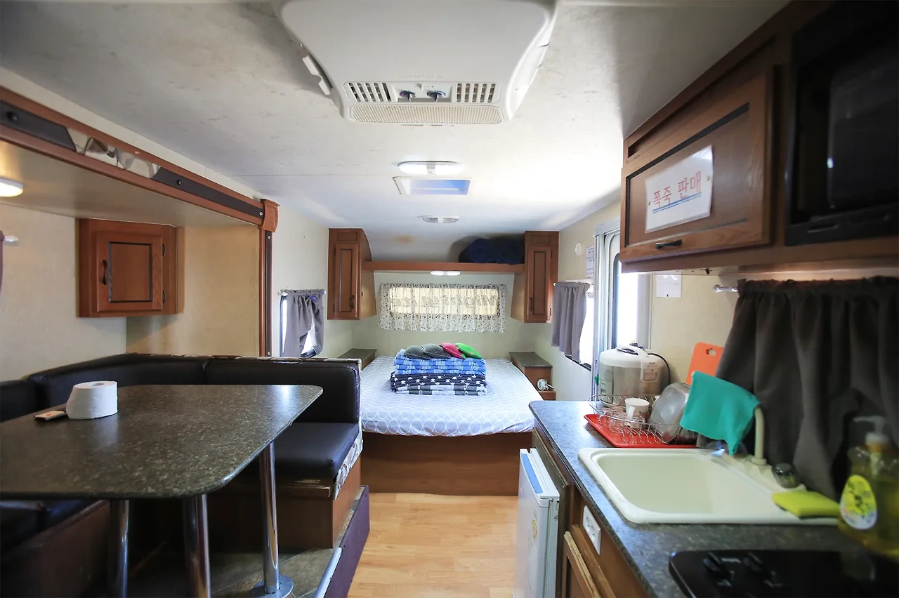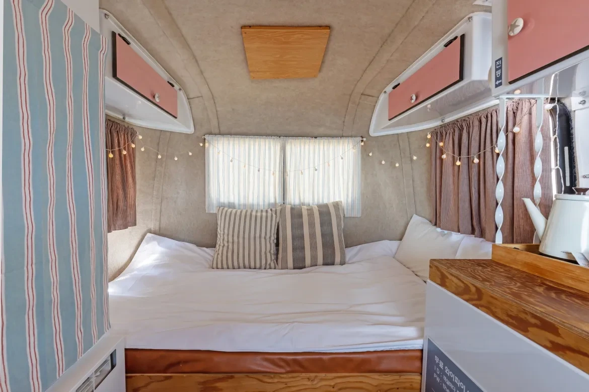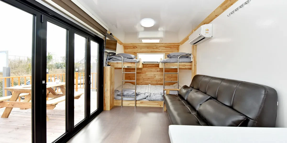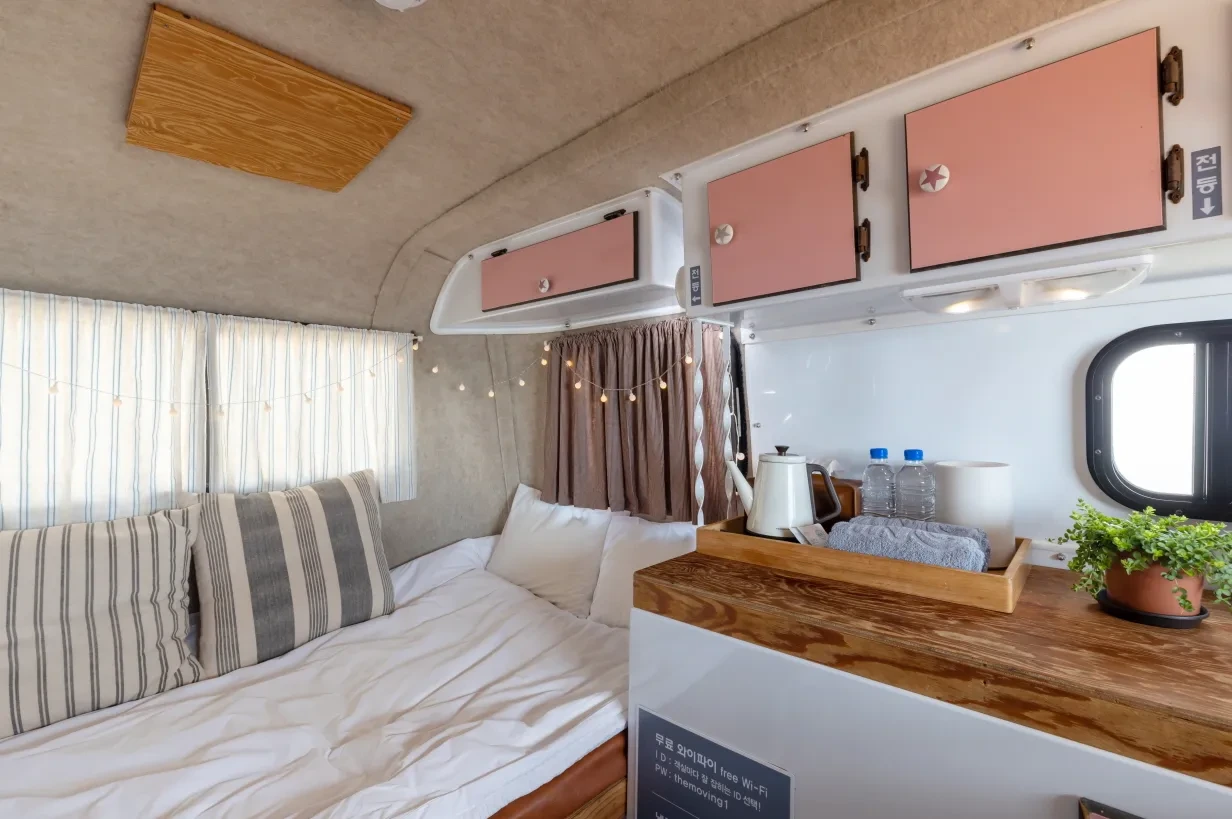 감성카라반 카우2 객실은 2인 베드 1개, 1인 베드 2개가 놓여 있다. 기준 인원 2명, 최대 인원 4명이 이용할 수 있다.